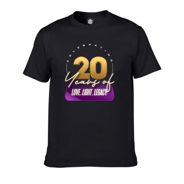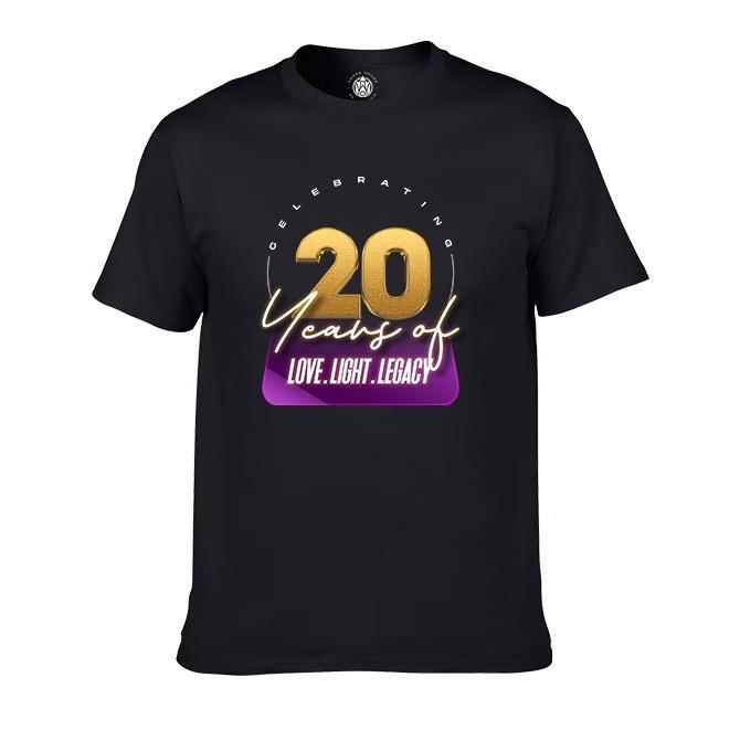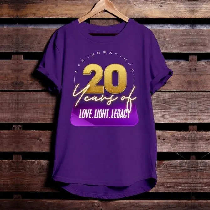 Celebrate 20 years of Love, Light, and Legacy with the Ever Brighter 20th Anniversary T-Shirt. This commemorative tee features a bold gold “20” design that honors AHOW’s journey and continued impact.